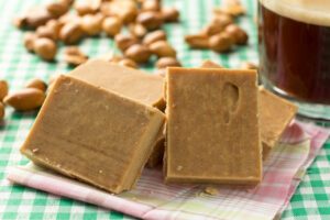 Ingredientes: 2 xícaras de amendoim torrado sem pele; ½ xícara de farinha de milho; 1 xícara de açúcar; 4 a 5 colheres (sopa) de leite.
